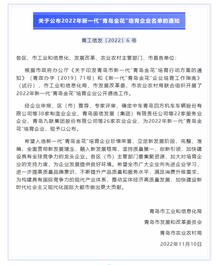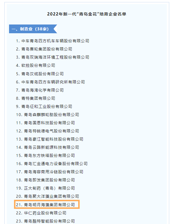 近日,從市工業(yè)和信息化局獲悉,青島明月海藻集團(tuán)榮獲2022年新一代“青島金花”培育企業(yè)稱(chēng)號(hào),這是我集團(tuán)連續(xù)四年獲此殊榮。據(jù)悉,該項(xiàng)榮譽(yù)由市工業(yè)和信息化局牽頭遴選,旨在遴選一批在行業(yè)中具有明顯規(guī)模優(yōu)勢(shì)和競(jìng)爭(zhēng)優(yōu)勢(shì)、擁有高品牌知名度和品牌價(jià)值的企業(yè),充分發(fā)揮企業(yè)的品牌影響力和主體作用,促進(jìn)企業(yè)做大做強(qiáng),推進(jìn)產(chǎn)業(yè)創(chuàng)新發(fā)展。