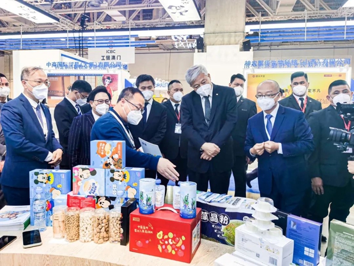 會(huì)展上,澳門特區(qū)行政長官代表、澳門經(jīng)濟(jì)財(cái)政司司長李偉農(nóng),國務(wù)院國資委國際合作局副局長謝暉,南光(集團(tuán))有限公司董事長傅建國、金沙中國有限公司總裁王英偉等到明月海藻集團(tuán)展區(qū)參觀指導(dǎo)。