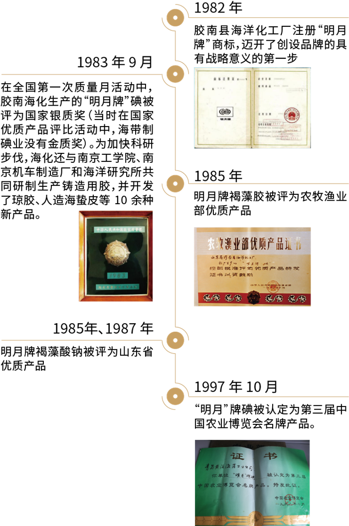 膠南縣海洋化工廠自籌建創(chuàng)始起,就高度重視新技術、新工藝、新產品和新品牌的研發(fā)創(chuàng)造,形成了注重技術改造、致力產品創(chuàng)新的傳統(tǒng)精神,并首創(chuàng)了一個美麗溫馨、蘊涵豐富、意義深遠的品牌——“明月牌”制碘產品。