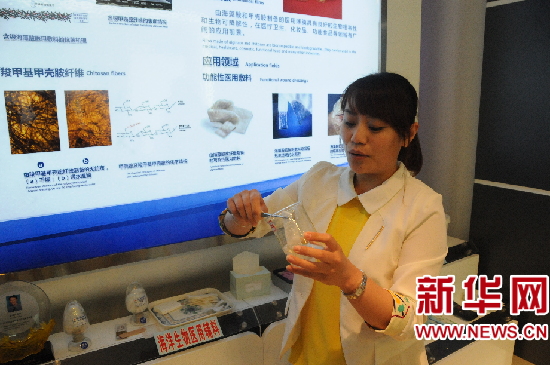 明月海藻集團(tuán)工作人員展示“無紡布”的特殊功效