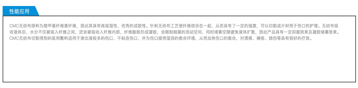 CMC無紡布是將羧甲基纖維素纖維以非織造工藝制備得到的無紡布產(chǎn)品。非織造布產(chǎn)品柔軟疏松,同時又具有一定強度。CMC無紡布經(jīng)后續(xù)分切可以制作成各種尺寸規(guī)格的敷料片材用于傷口護理。公司具有小批量研發(fā)及大規(guī)模生產(chǎn)所需要的各種設備,可根據(jù)客戶要求生產(chǎn)多種克重和寬幅的卷材,并可根據(jù)需要切割成任意規(guī)格的片材。